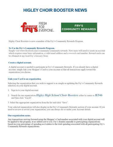 As a Fry’s Community Rewards participant, your nonprofit organization will earn rewards with every eligible purchase made by your enrolled supporters with their Fry’s VIP card. Your organization’s percentage of our total donation amount is based on the percentage of your supporters spending as related to the total spending of all participating Fry’s Community Reward supporters.